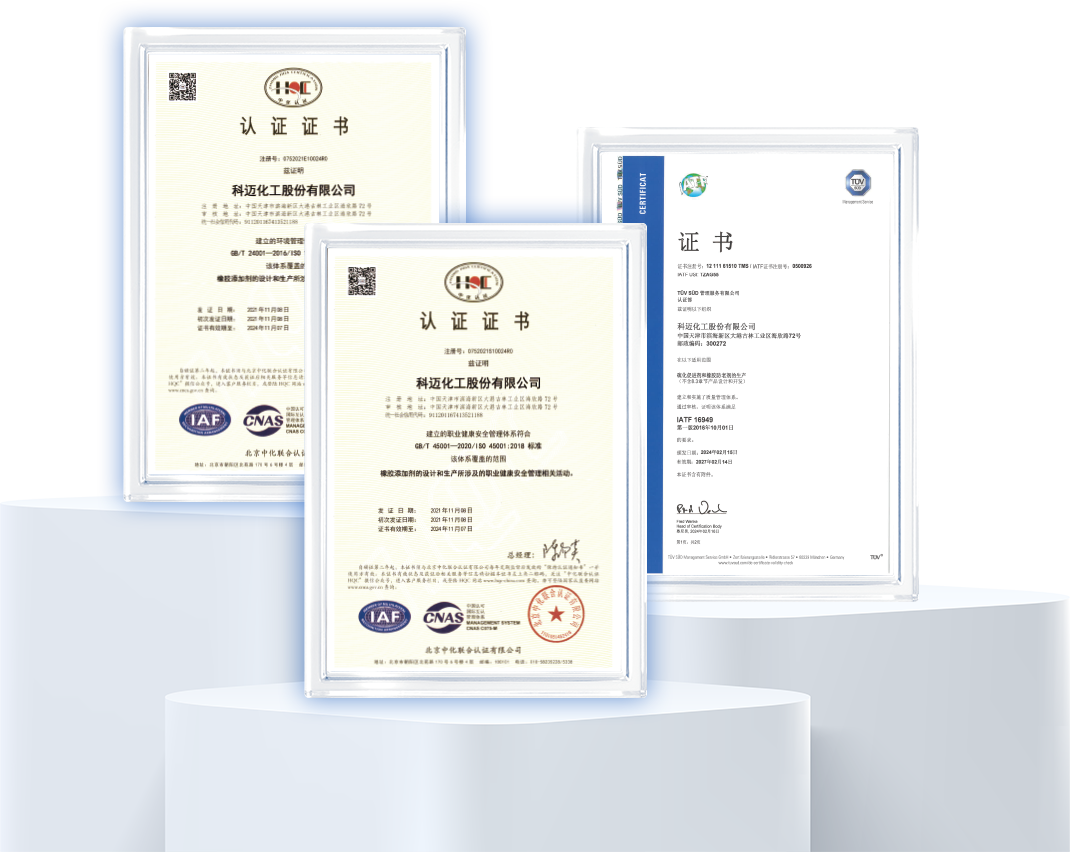 科邁是ISO/TC045/SC03/WG03 橡膠和橡膠制品工業(yè)中所用炭黑、二氧化硅和橡膠助劑原料標(biāo)準(zhǔn)化工作組專家單位,全國標(biāo)委化學(xué)助劑分委會委員單位,負(fù)責(zé)起草國家及行業(yè)標(biāo)準(zhǔn)15項(xiàng),主導(dǎo)完成行業(yè)內(nèi)大部分橡膠助劑產(chǎn)品的標(biāo)準(zhǔn)化工作。